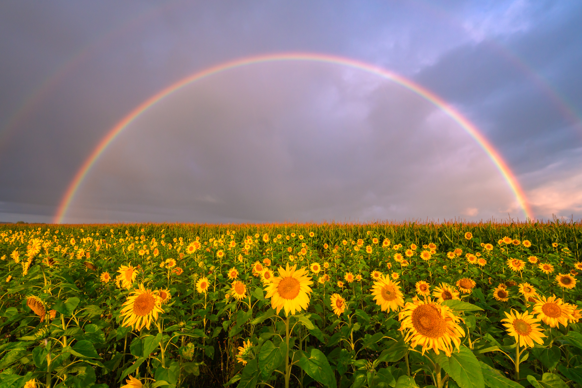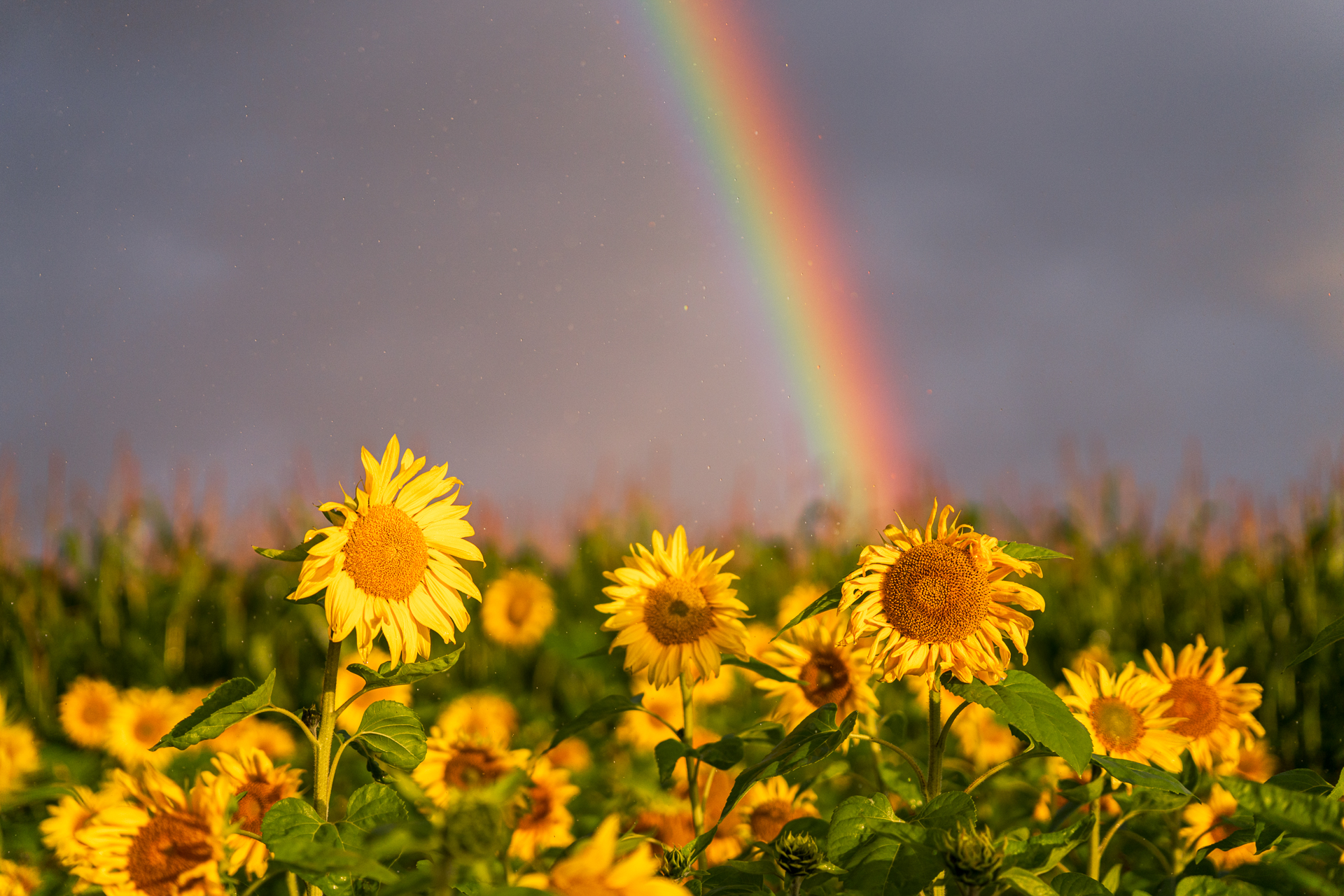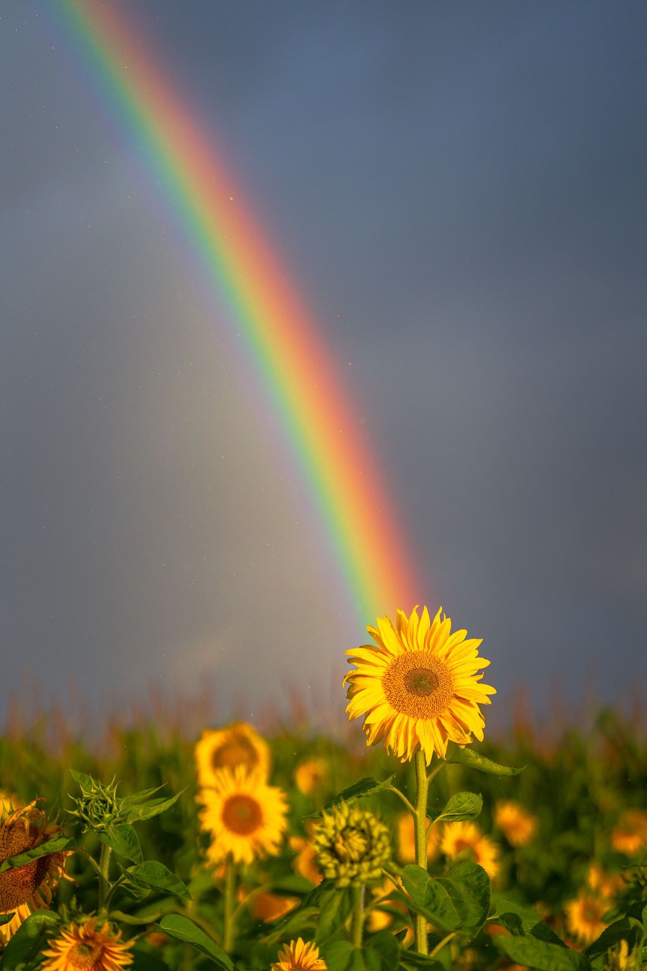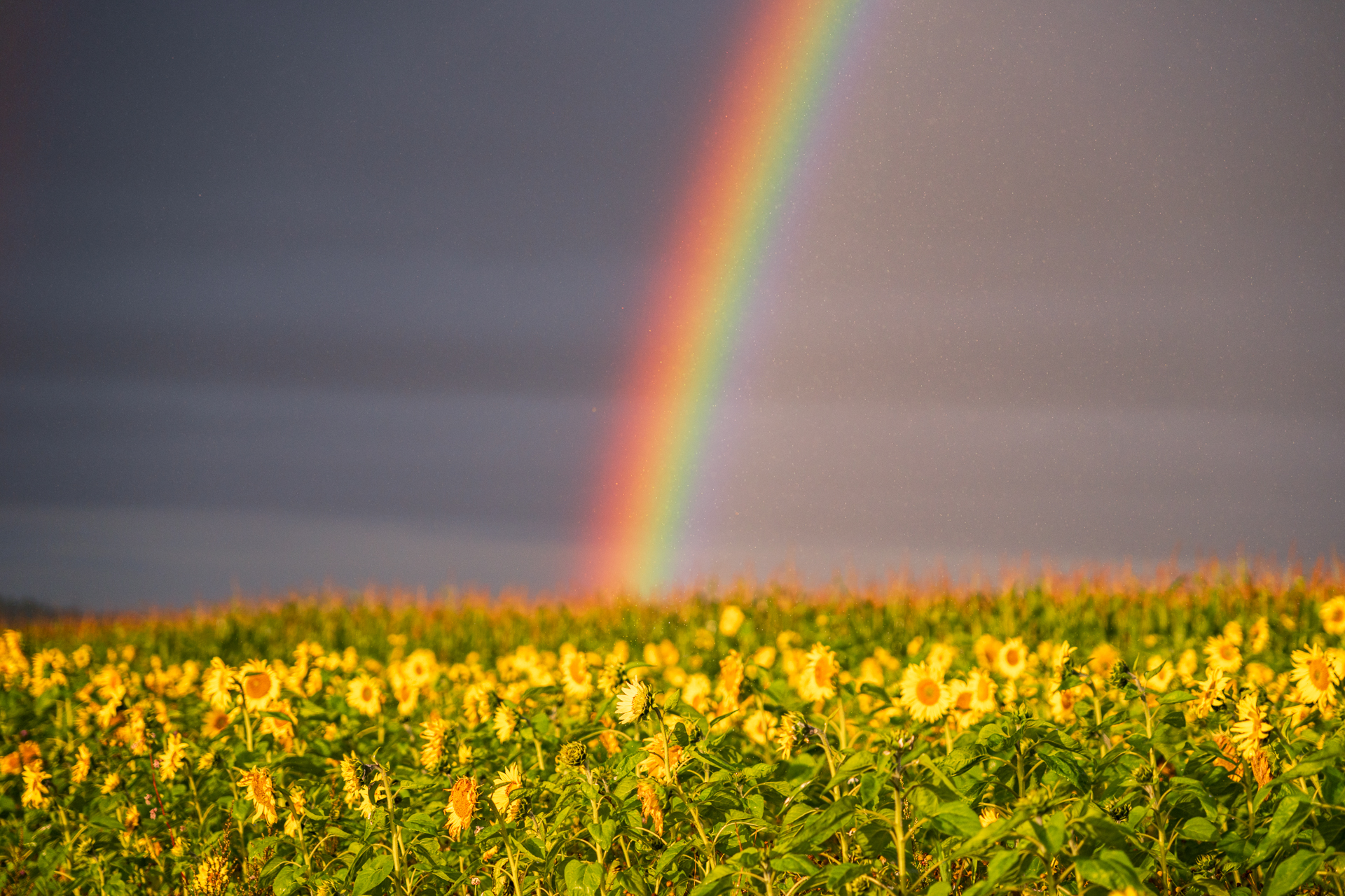 Päevalillepõllu kõrval olid traktori jäljed ja sain mööda neid kiirelt liigelda. Umbes paari minuti pärast oli päike väljas, vihma ikka kallas ja vikerkaare kaar täies ulatuses päevalillede kohal. Sain kohe aru, et see on minu selle aasta siiamaani kõige ebareaalsem hetk mida loodus mulle andnud on. Olin juba üsna läbi vettinud koos oma kaameraga. Esimesed fotod jäädvustasin täiesti märja objektiivi esiklaasiga. Õnneks ma märkasin seda ja tegin klaasi puhtaks. Pildistasin erinevaid nurkasid ning mis iganes minu silmad nägid, et vastavad kiired kompositsiooni mõtted kaadrisse saada. Järsku oli tekkimas ka hägune teine vikerkaar! Kahjuks see tervenisti 16mm objektiiviga kaadrisse ei mahtunud ja laiem 14mm objektiiv mul kaasas ei olnud. Pildistasin küll kiirelt püstikaadritega panoraami, aga selle keerasin tuksi ja kokku see foto ei läinud. Võtsin lõpuks kõik, mis võtta andis ja siis vahetasin kiirelt kaamera ette teise 28-105mm F/2.8 avaga objektiivi, et detaile pildistada. Teadsin, et ega mul palju aega ei ole ja tuleb kiirelt võtta seda viimast. Kaadrite vahel tegin kiirelt telefoniga veel paar videot, et hiljem sotsiaalmeedias ka neid hetki jagada.